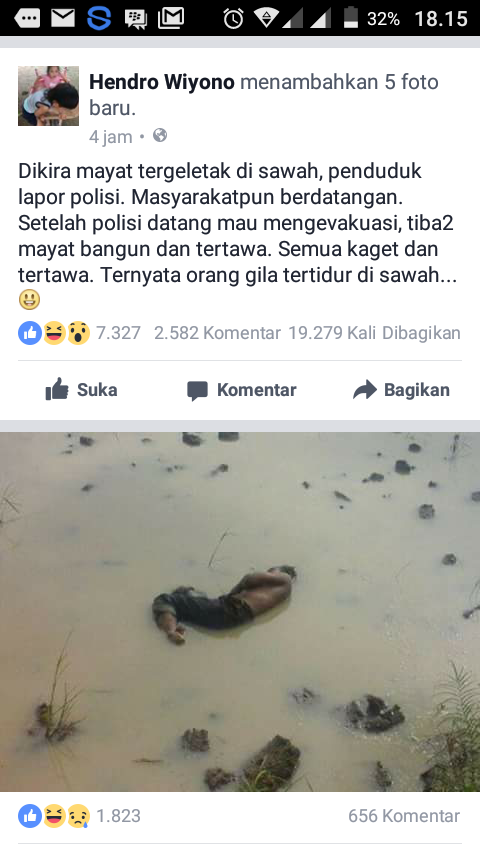 Brosis, sebuah kejadian menghebohkan dan lucu terjadi di jawa tengah. Seorang Netizen asal Pati, Jateng yaitu Hendro Wiyono mengupdate sebuah kejadian lucu yang terjadi di suatu desa. Yaitu kejadian seorang laki laki yang ditemukan seperti mayat di sawah penuh air.