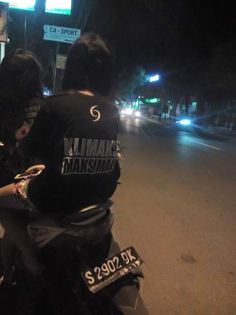 Jika normalnya, tak ada yang aneh pada model baju dan gaya karena tidak terlalu senonok. Namun, kata kata yang tertulis baju itulah yang aneh.