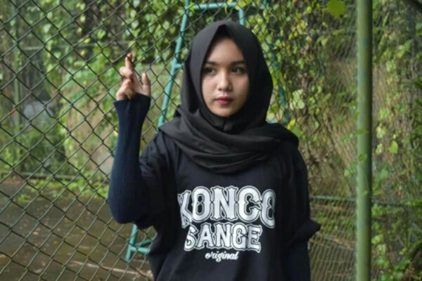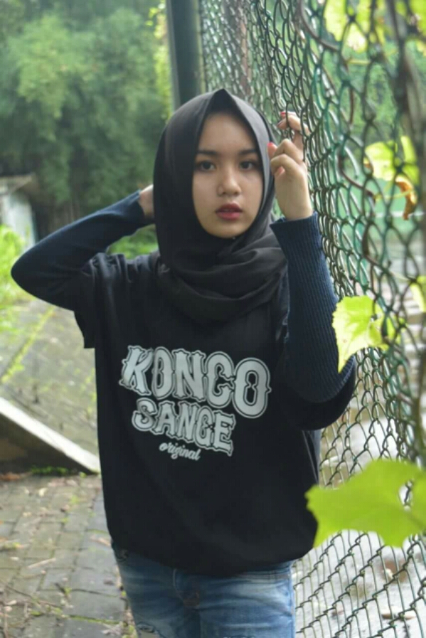 Model kalem, jilbab, pakai jean, menampiokan baju dengan tulisan yang tabu jika disandingkan dengan modelnya. Konco Sange, sange sendiri punya arti :