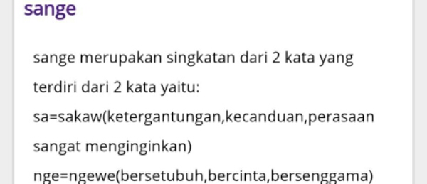 Sange sendiri jadi kata yang mungkin beberapa daerah belum paham. Kata kata ini beredar di kalangan anak gaul nakal, mereka yang pecandu seks, dan porno.