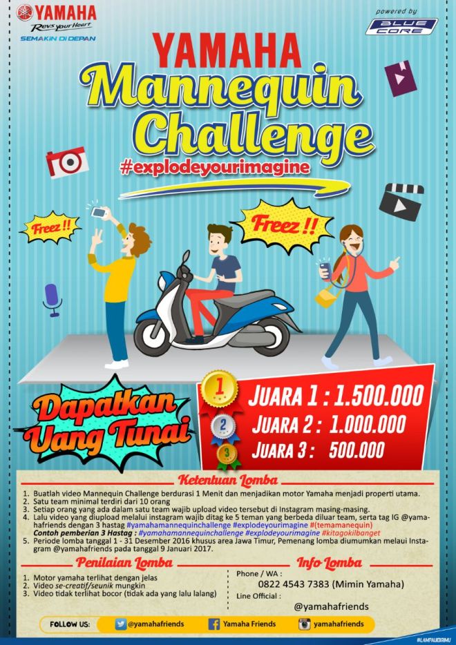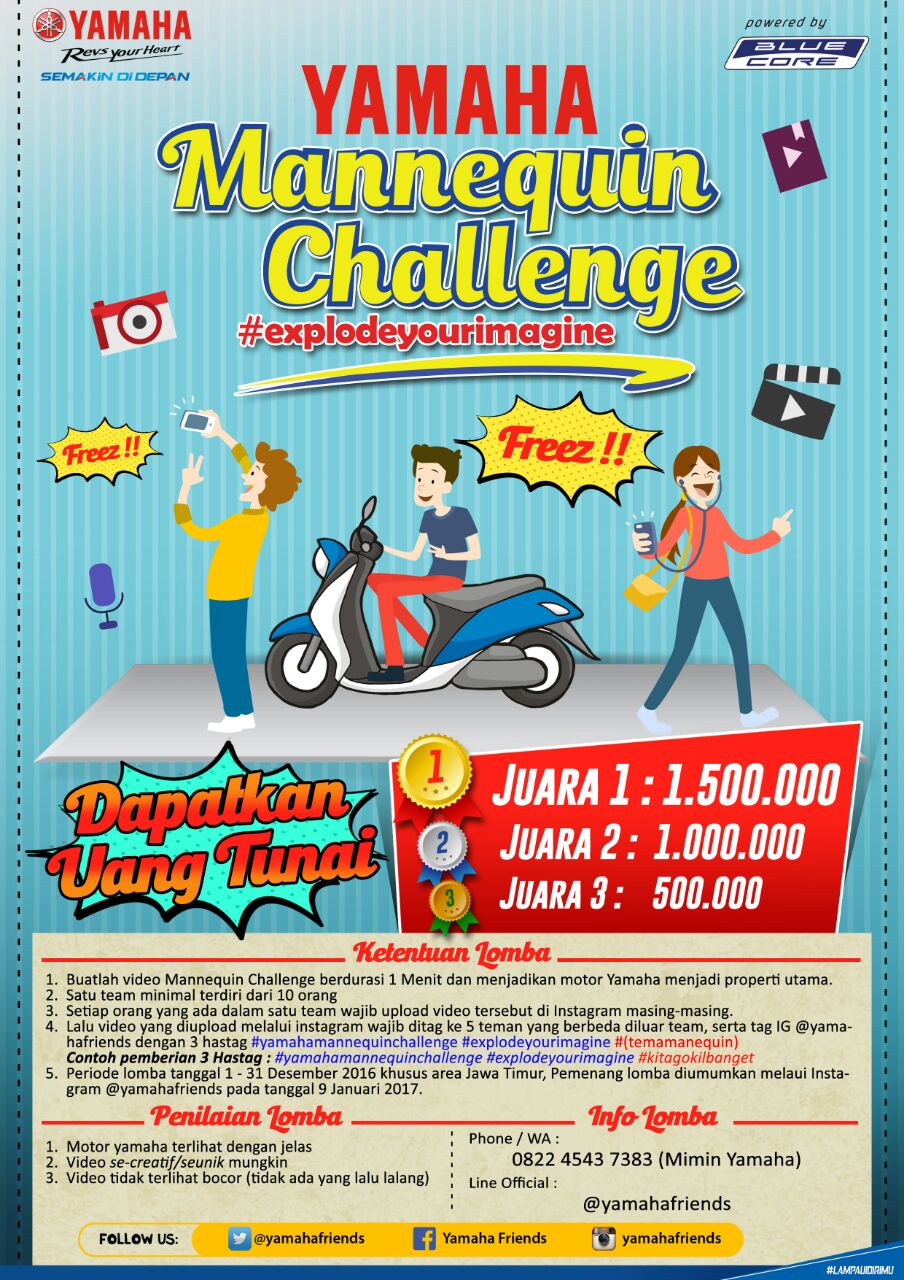 Brosis, bro ndess dapat info terbaru dari Yamaha Jatim. Ada lomba seru yang wajib diikuti oleh brosis yang punya kreatifitas tinggi di bidang film atau akting, Yamaha menantangmu dalam Event Mannequin Challenge. Pasti tahukan trend video bergaya patung ini?