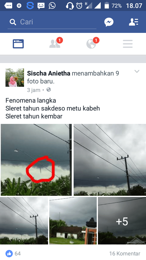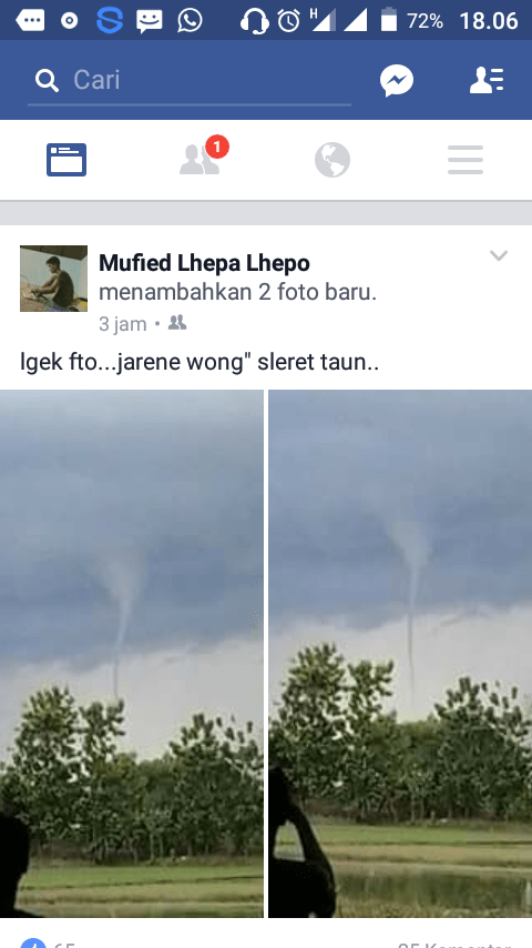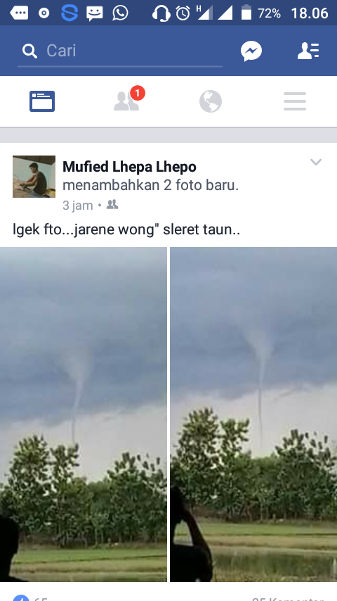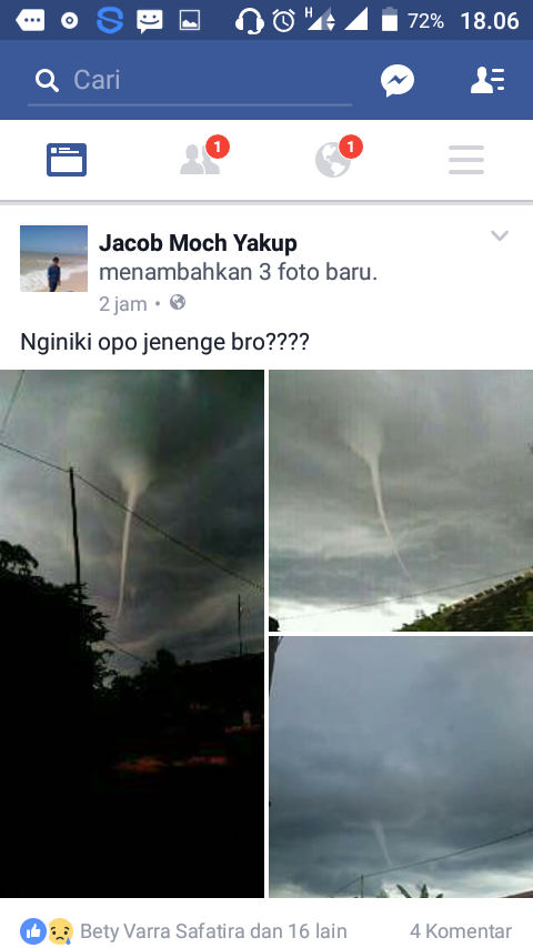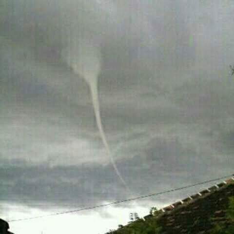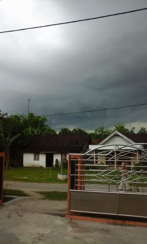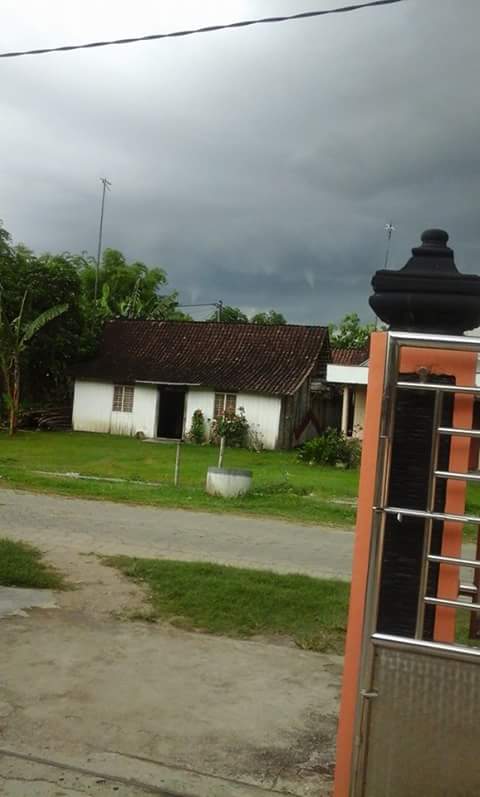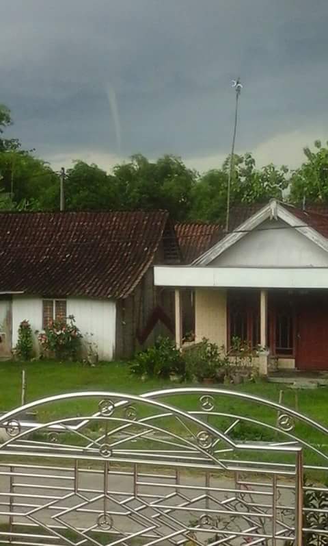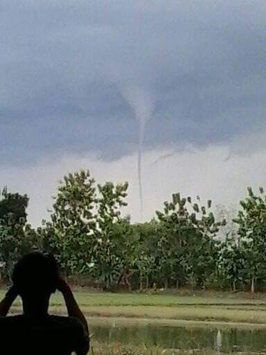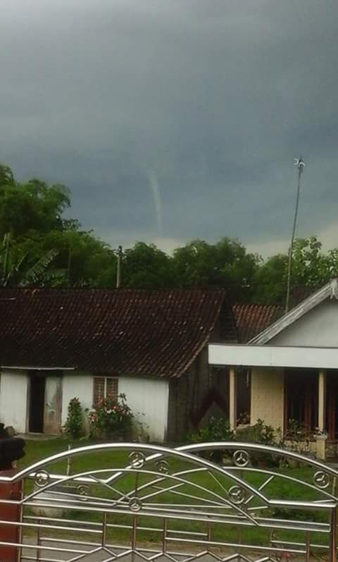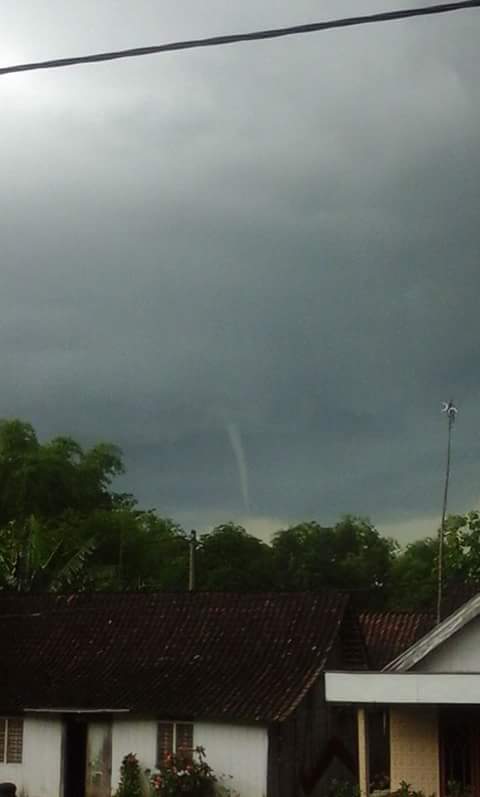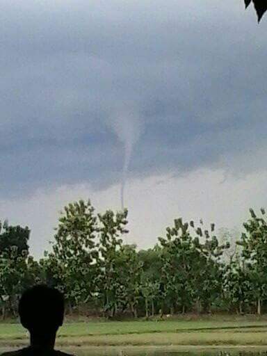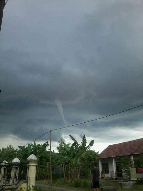 Brosis, kemarin Bojonegoro hingga Surabaya diterpa hujan lebat berkepanjangan. Hujan yang memang biasanya jelang pergantian tahun pasto lebat ini, mengguyur wilayah Pantura. Mendung gelapnya masih ada sampai pagi ini. Namun, sebuah fenomena alam yang dianggap mengerikan terjepret kamera. Yaps, angin puting beliung atau kalau orang Jtv bilang pentil muser.