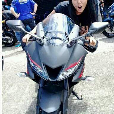 Up side down hitam, desain fairing ala M1 dengan lubang udara ditengah, garis desain aura moge R series, buntut seksi dengan body berlubang. Ban’pun naik sati tingkat depan 100 belakang 140. Makin gambot.