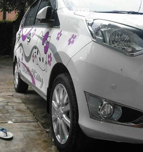 Adalah jenis Hello Kitty biasanya yang jadi pilihan. Bro ndess mendapatkan gambarnya di group CALSIG di facebook. Livery hello kitty yang dipakai dipasang dibagian samping mobil. Dengan motif bunga dan garis minimalis. Serta ikon hello kitty. Selain itu, dibagian kap mesin ada ikon wajah hello kitty di sebelah kiri.