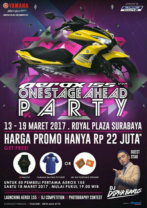 Brosis, bertajuk one stage ahead Aerox 155. Yamaha STSJ mengadakan event sekaligus launching skutik terbaru berteknologi VVA. Bertempat di Royal Plaza Surabaya yang memang jadi langganan event Yamaha. Acara akan berlansung mulai tanggal 13-19 maret. Ada beberapa info menarik.