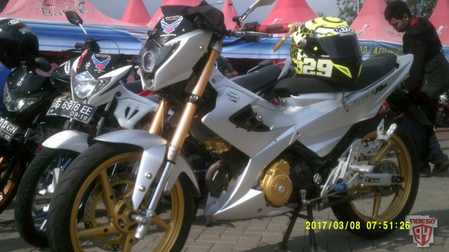 Brosis, di acara Suzuki Bike Meet kemarin beberapa motor komunitas menarik perhatian bro ndess. Kenapa? Karena sudah dimodif keren-keren. Seperti modifikasi pada Suzuki Satria FU euro 3 ini. Berlabur warna putih, motor Satria FU ini terparkir rapi.