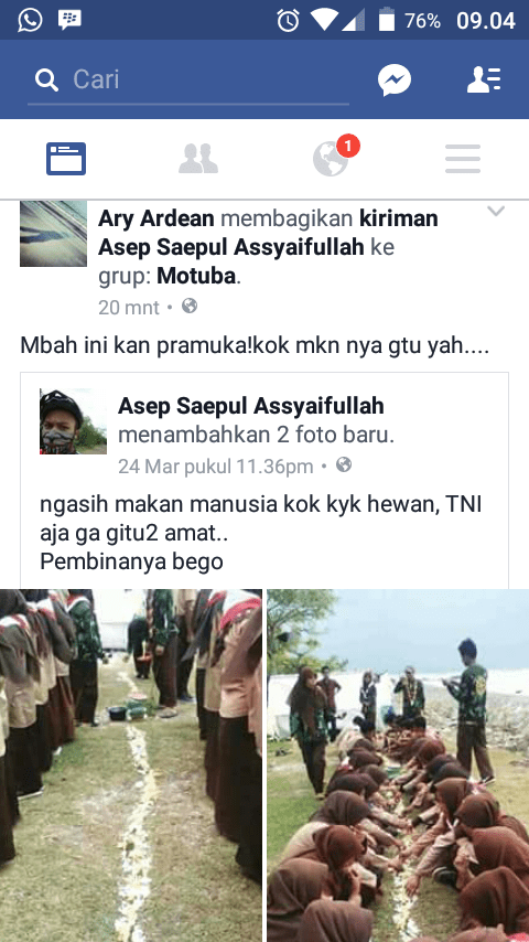 Adalah Asep Saepul yang mengunggah foto ini. Foto beberapa adik pramuka yang melakukan kegiatan kemah di sebuah tempat. Sebenarnya foto ini biasa, jika brosis tahu bahwa yang berbaris lurus itu adalah makanan. Pasti lansung naik pitam dah. Bahkan TNI pun tidak seperti ini! Ini sudah penghinaan kemanusiaan. Seakan adik-adik pramuka ini, rendah harga diri. Mental? Ini keterlaluan bung.
