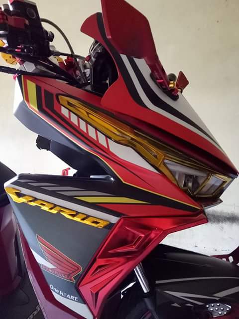 Sisi ini, sang owner memakai Visor Nmax. Pemasangannyapun rapi. Dipasang juga spion di visor ini, sayangnya sih spiom kecil tapi buat gaya its oke. Ada tambahan aksesoris garnis thailand di dek bawah dengan warna merah, menyesuaikan livery. Ada tambahan emblem Vario yang berwarna kuning di sisi samping.