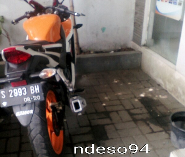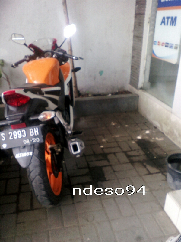 Nah, bagaimana jika knalpot CBR K56 dipasang di CBR K45? Ketemu di sebuah bank BRI Sumberrejo, Bojonegoro. Sosok CBR K45 repsol memakai knalpot CBR K56. Kok radak gimana ya? Terlihat ketidaksinkronan desain, mirip kayak GL Max dipasang kalpot tiger. Gak cocok secara look sebenarnya. Selera orang beda sih.