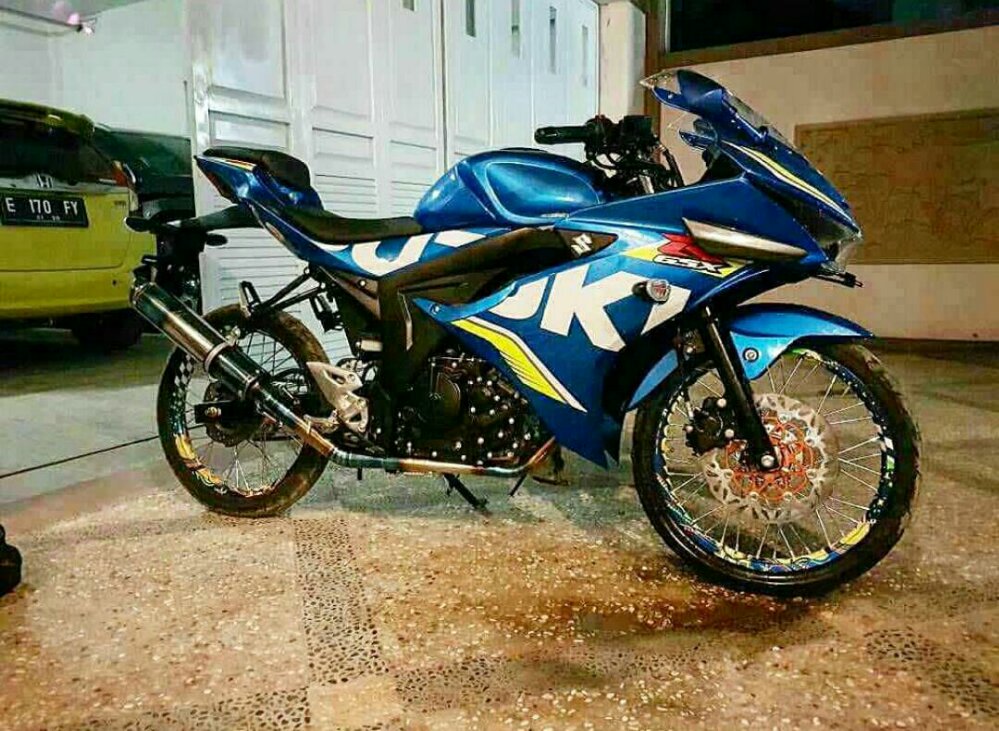 GSX-R150 ini salah satunya, bersumber dari group Dgujubar yang share foto ini. Motor GSX yang dimodifikasi ala ban jari-jari. Tampilan motornya sendiri terlihat standart. Beberapa ubahan minimalis dilakukan layaknya motor Thailook. yaitu muffler racing, velg alumunium berwarna warni.