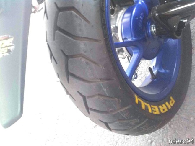 Bagian kaki-kaki standart, memakai ban merk Pirelli. Ban pun dikasih emblem custom dari karet, bertuliskan Pirelli. Keren loh ini, jadi lebih awet ketimbang cuma pakai spidol Toyo.