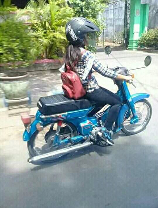 Kalau gini kan dilihat sedap. Banyak pecinta otomotif yang mungkin bakal memuji gadis cantik satu ini, karena berani naik motor yang dianggap motor kebon. Keren brosis!