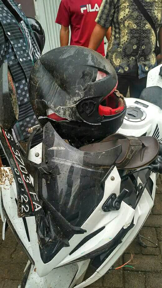 Seperti kejadian kecelakaan di Tuban ini, sebuah CBR150 mengalami crash. Pengendaranya memakai helm bawaan motor, TRX Full face. Sepertinya menghantam sesuatu dengan keras. Terlihat bentuk helm yang mengalami perubahan bentuk.