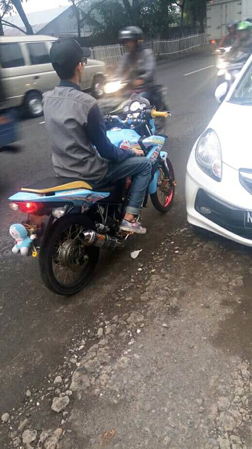 Modifikasi lainnya, seperti ban cacing dan velg jari jari. Warna merah untuk depan, dan hitam untuk belakang. Kemudian muffler custom. Sayangnya spiom tidak dipasang. Untuk part lain sih standart. Ada yang unik, bagian plat belakang memakai braker kupu kupu warna kuning. Nah, ada boneka doraemon kecil yang menghiasi. Plat nomornya kemana ini…..