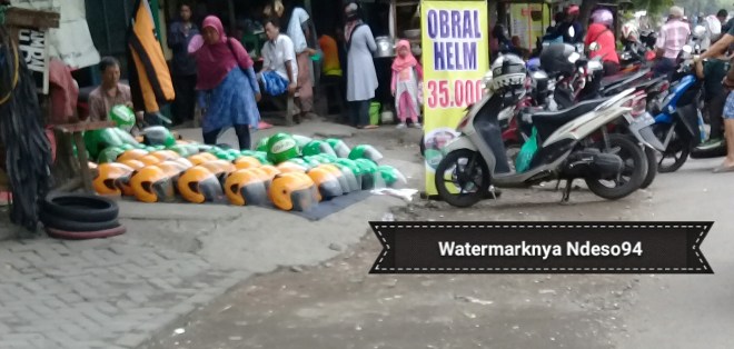 Jalan Demak, 20 meter setelah Indomaret Demak. Terbukti, info tersebut akurar. Ada pedagang yang menjual helm ojek online dari 3 operator. Yang aneh adalah harganya Rp 35.000!!! Kok murah banget, ngalahin helm obralan biasa.