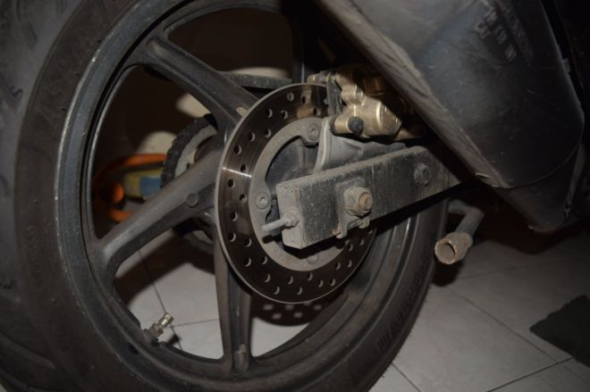 Seakan gak cukup dengan monoshock, Owner Otobalancing.net ini juga memodifikadi bagian rem belakang. Dengan memakai RDB layaknya sport jaman now di Indonesia. Tentu pemasangan cakram di velg memakai adaptor cakram khusus.