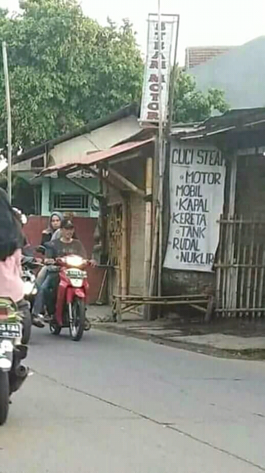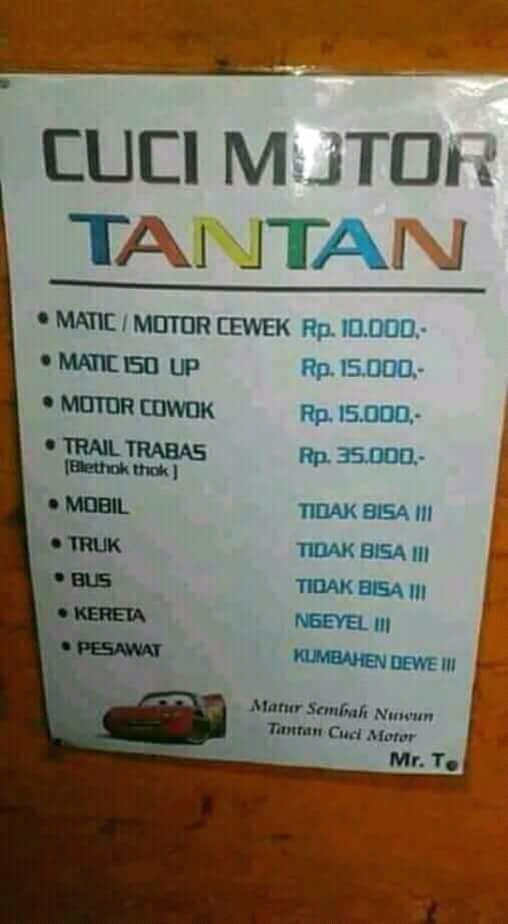 Nah, ada dua spanduk unik yang berada di beberapa tempat cuci kendaraan yang mungkin bisa bikin ketawa. Seperti di bawah ini ;