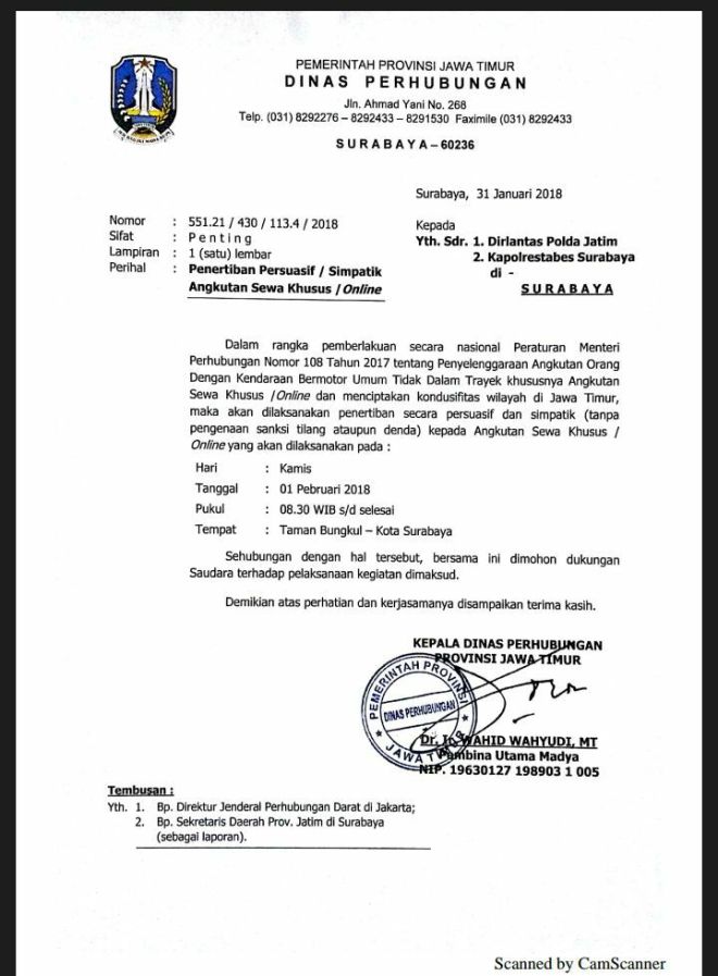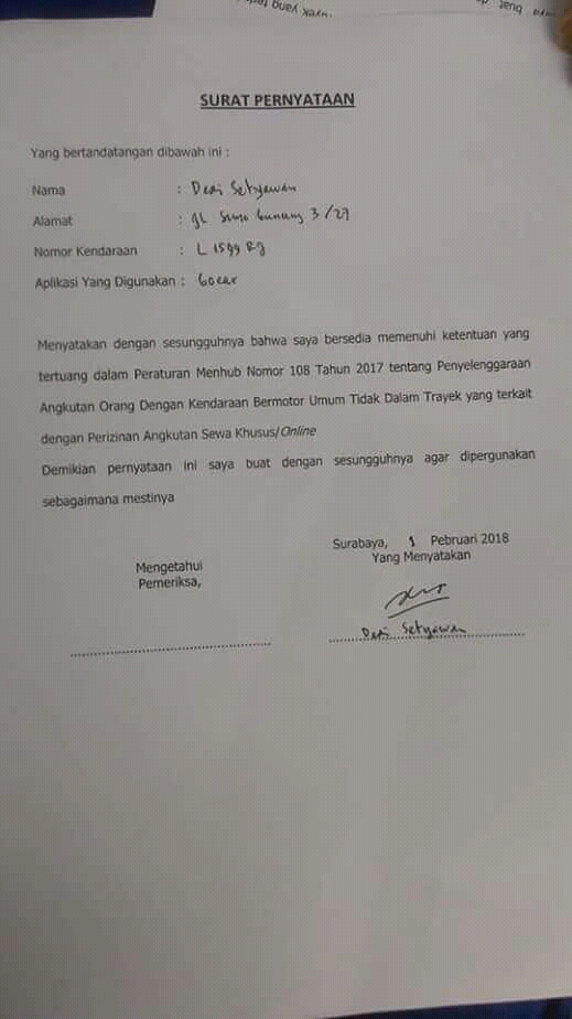Nah, tetiba hari ini terjasi hal unik yang membuat bingung juga driver Taxol di Surabaya khususnya. Dishub Surabaya, melaksanakan sosialisasi kepada para driber Taxol. Bahasanya memang sosialisasi, walau ternyata ada razia dan pemaksaan ttd surat pernyataan. Beberapa member Komunitas Grab Car Surabaya melaporkan, adanya indikasi pemaksaan surat pernyataan yang disinyalir untuk membuat seolah driver taxol sepakar permenhub 108.