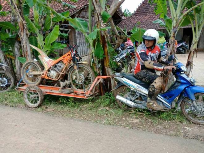 Untuk itulah motor untuk cross biasanya diangkut menuju event. Biasanya menggunakan Dcab, atau mobil dengan gandengan towing, atau biaa juha pickup roda 3 atau 4. Offroader satu ini Eko Sunanto, bisa dicontoh. Membuat towingnya sendiri.