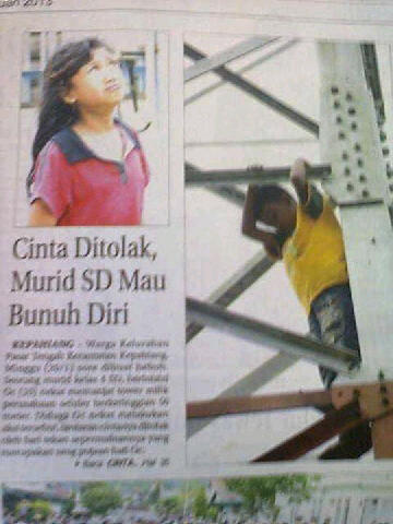 Miris, liat gambar jepretan koran di atas. Ada aja ya? Sebuah berita yang memperlihatkan seorang anak laki-laki SD yang mau bunuh diri karena ditolak cintanya. Weleh? Lanjutkan membaca Di tolak cinta, siswi SD mau bunuh diri? salah gaul!