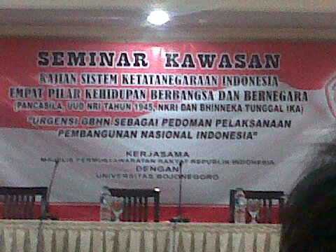 Hari kamis(28/11), ane ikut seminar di GDK Bojonegoro, dengan tema “Empat pilar kehidupan berbangsa dan bernegara” yang kayaknya berfokus pada penegakan UUD dan Pancasila. Kerjasama Unigoro dan MPR-RI Fraksi PDI-P.