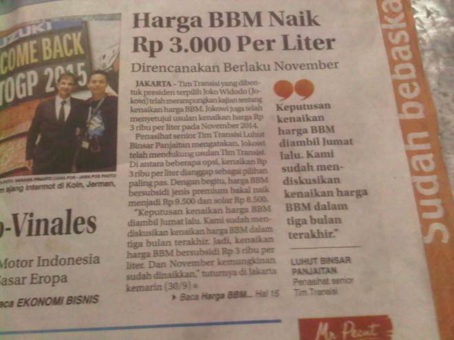 Wacana menaikkan harga BBM sudah masuk media publik dan bukan lagi kabar angin. Bahan Bakar bersubsidi nantinya akan mengalami kenaikan cukup tinggi. Yups, premium 9500/L dan sola 8500/L. Semua ini akan dilaksanakan jika disetujui akan naik pada November 2014.